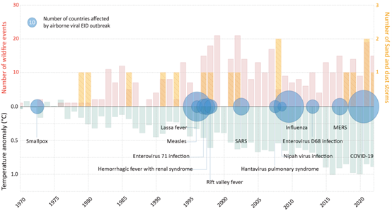 图1. 极端气候事件和空气传播的新发传染病大爆发的时间趋势