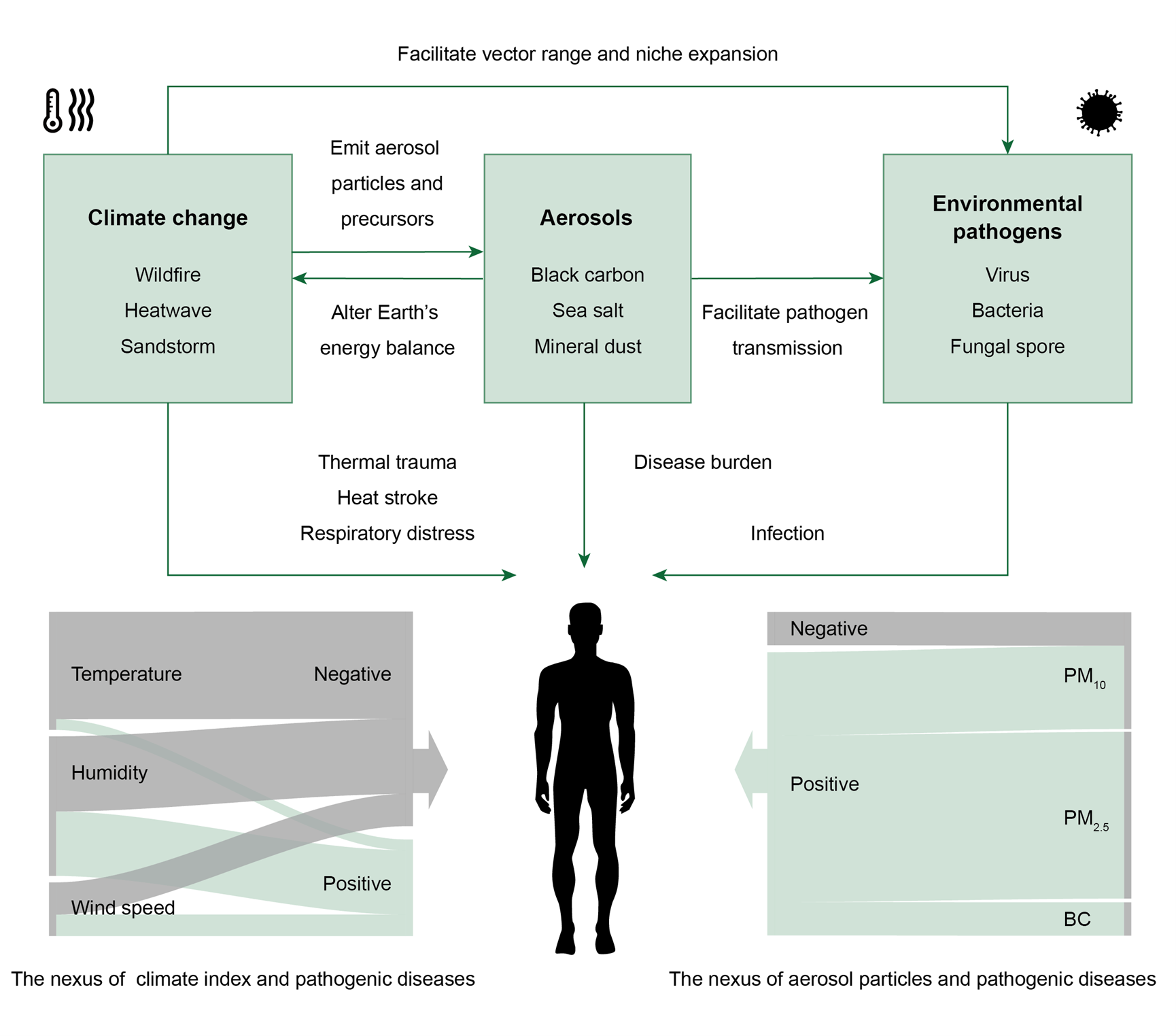 图2. 气溶胶颗粒在气候变化及病原性疾病间的耦合关系