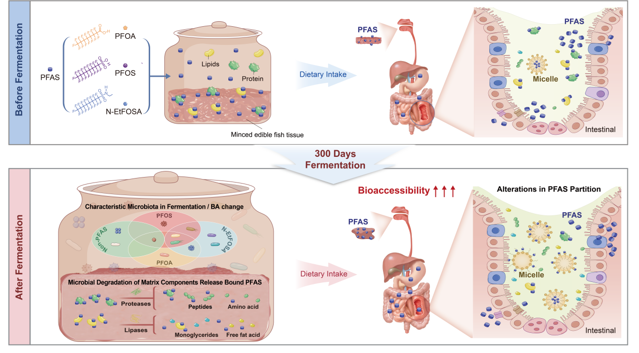 环境化学与环境毒理全国重点实验室王亚韡课题组在全氟和多氟烷基化合物(Per- and polyfluoroalkyl substances, PFAS)的膳食暴露风险研究中取得新进展。该研究首次系统阐明了传统发酵过程对鱼类产品中PFAS生物可给性的放大效应及其微观机制。相关研究成果以“Traditional Fermentation Amplifies PFAS Bioaccessibility: Defining Fermented Fish Products as an Unrecognized Source of Dietary Exposure”为题,发表于Environmental Science & Technology。