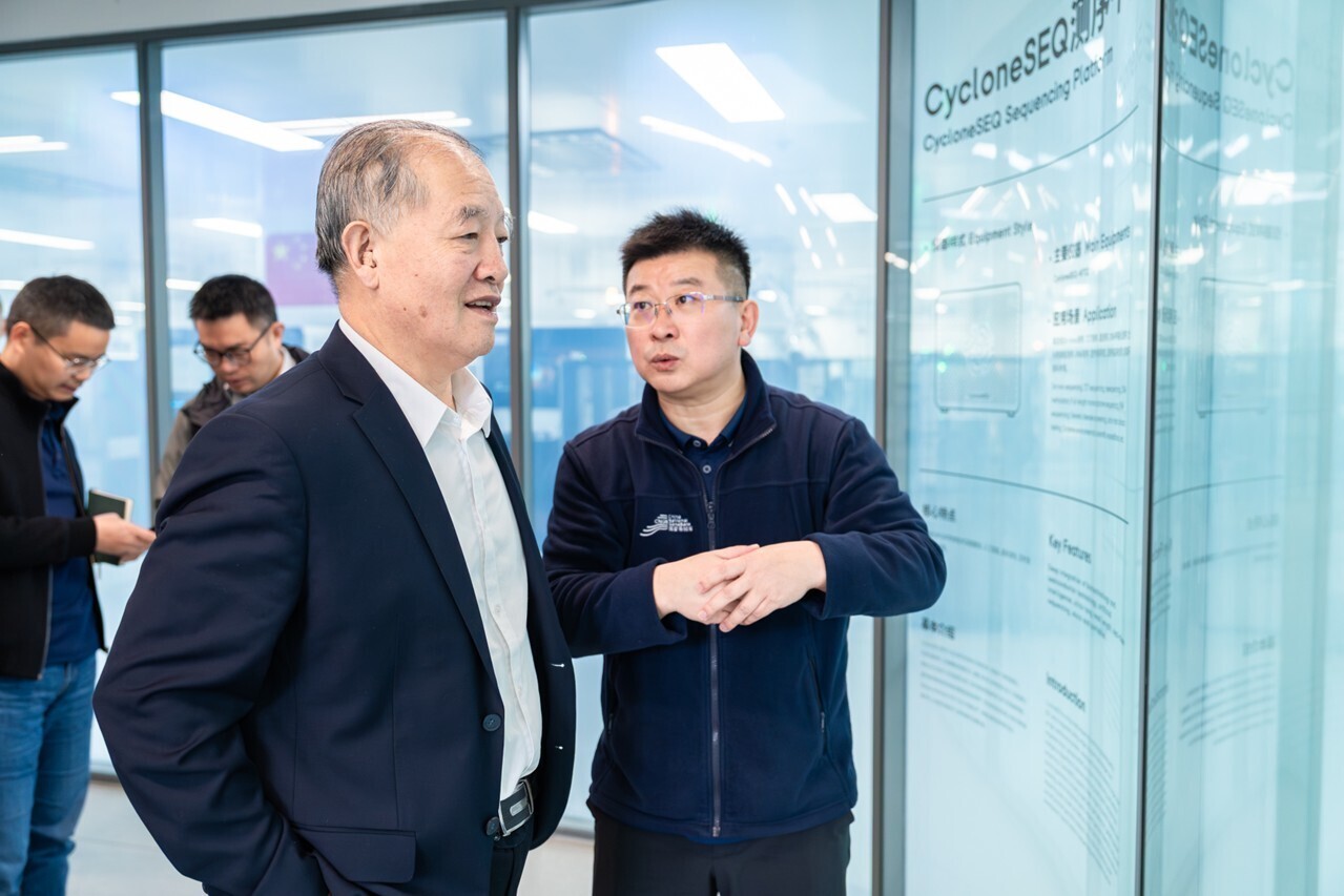 随后,在华大团队的陪同下,江桂斌院士一行实地参观了华大基因、华大智造及华大细胞实验室,近距离观摩了 DNBSEQ-T7 等超高通量测序仪的自动化运行流程,详细了解了时空组学技术、多组学分析、靶向代谢组检测等核心技术的应用场景。